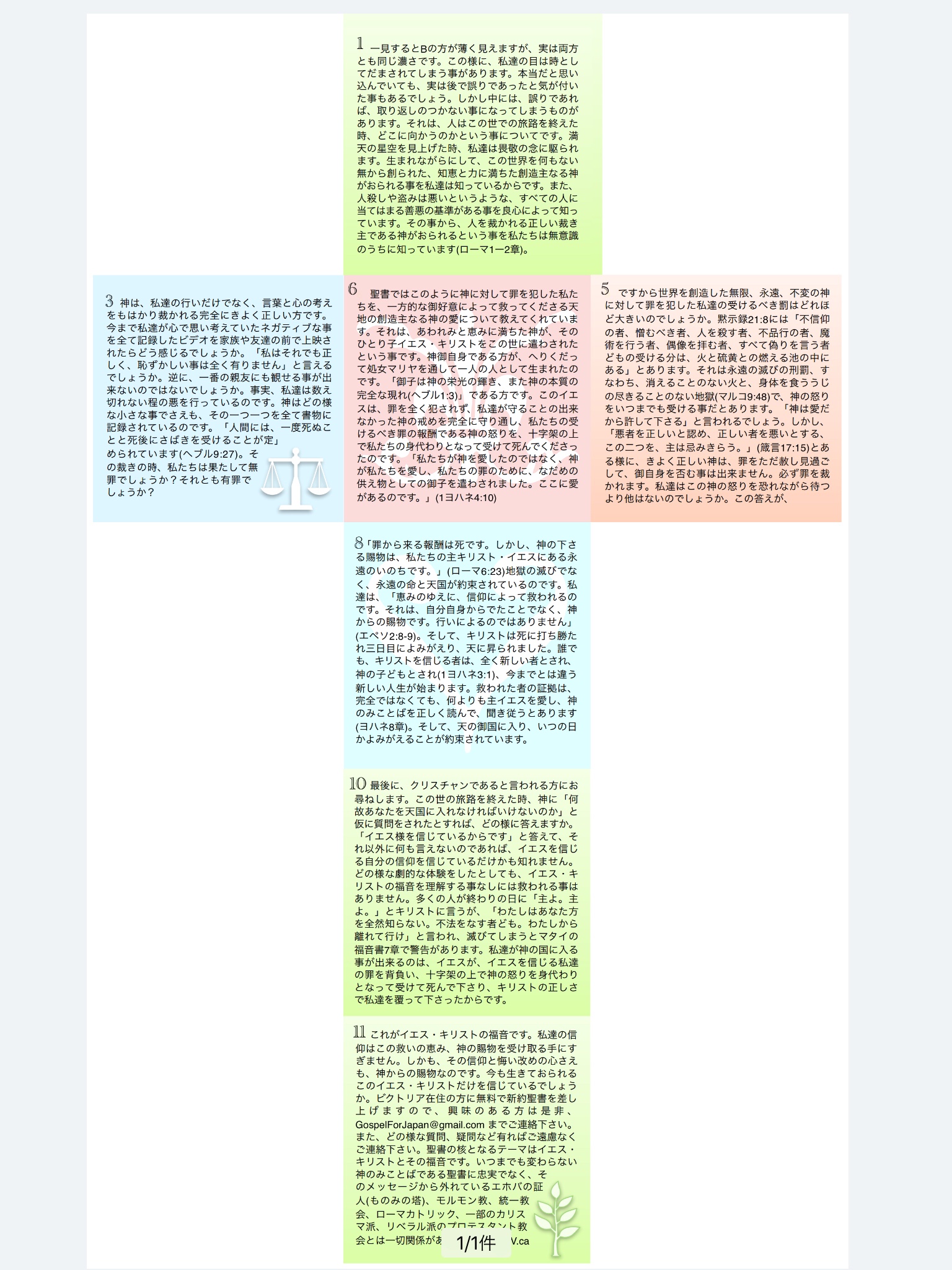 11 これがイエス・キリストの福音です。私達の信仰はこの救いの恵み、神の賜物を受け取る手にすぎません。しかも、その信仰と悔い改めの心さえも、神からの賜物なのです。今も生きておられるこのイエス・キリストだけを信じているでしょうか。ビクトリア在住の方には無料で新約聖書を差し上げますので、興味のある方は是非、GospelForJapan@gmail.com までご連絡下さい。また、どの様な質問、疑問など有ればご遠慮なくご連絡下さい。聖書の核となるテーマはイエス・キリストとその福音です。いつまでも変わらない神のみことばである聖書に忠実でなく、そのメッセージから外れているエホバの証人(ものみの塔)、モルモン教、統一教会、ローマカトリック、一部のカリスマ派、リベラル派のプロテスタント教会とは一切関係がありません。